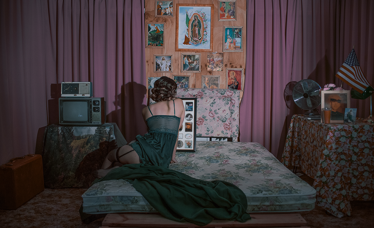 Mi obra fotográfica explora la autorrepresentación femenina a través del manejo del color y el diseño de producción. Trabajo el montaje de escenografía para reconstruir y representar la estética íntima fronteriza y del norte del país.